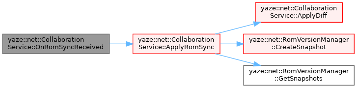 References ApplyDiff(), config_, yaze::net::CollaborationService::Config::create_snapshot_before_sync, yaze::net::RomVersionManager::CreateSnapshot(), yaze::net::RomVersionManager::GetSnapshots(), yaze::Rom::is_loaded(), last_sync_hash_, yaze::net::RomVersionManager::RestoreSnapshot(), rom_, sync_in_progress_, and version_mgr_.