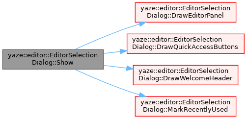References DrawEditorPanel(), DrawQuickAccessButtons(), DrawWelcomeHeader(), editors_, ICON_MD_APPS, is_open_, MarkRecentlyUsed(), recent_editors_, selected_editor_, and selection_callback_.